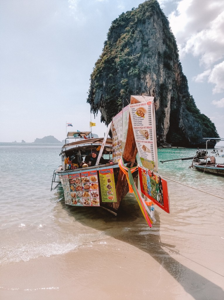 Bij de bootjes die aan de kust van het Phra Nang strand liggen kun je heerlijk eten en drinken kopen, dat op de boot voor je klaargemaakt wordt. Weer een hele leuke, nieuwe ervaring zal ik maar zeggen.